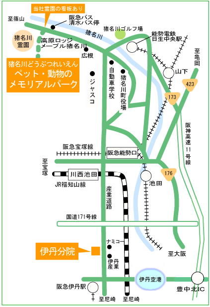 阪急川西能勢口駅、JR川西池田駅から[県道12号線]を北上30分。