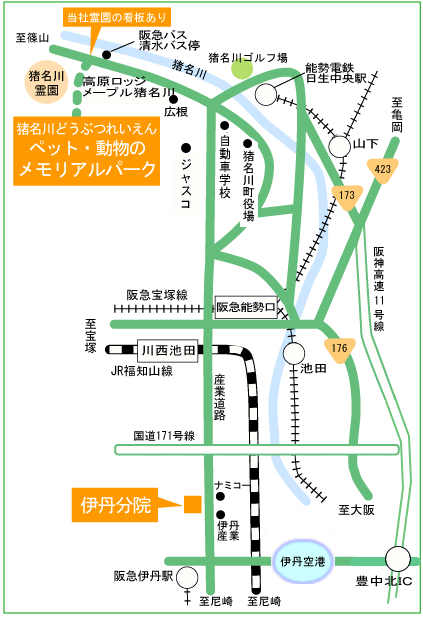 阪急川西能勢口駅、JR川西池田駅から[県道12号線]を北上30分。